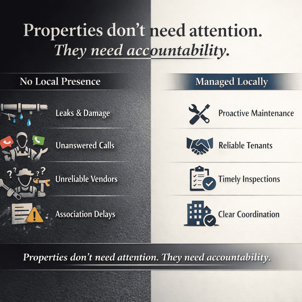 At the heart of most problems faced by absentee property owners is the absence of local accountability. When no one is clearly responsible on the ground, maintenance work lacks supervision, association coordination becomes inconsistent, and vendors operate without proper oversight.